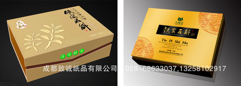 成都包裝廠為客戶定制兩款鐵皮石斛禮品盒,第一款:封面采用銅版紙印刷,覆啞膜,“鐵皮石斛”文字燙黑金,裱工業(yè)紙板,內(nèi)村為泡沫綢布,圍框用棕色特種紙裱工業(yè)紙板,結(jié)構(gòu)為書(shū)型盒盒型。第二款:封面采用銅版紙印刷,覆啞膜,裱工業(yè)紙板,內(nèi)村為白色EVA,內(nèi)貼是黃色特種紙,結(jié)構(gòu)為連體天地蓋盒型。