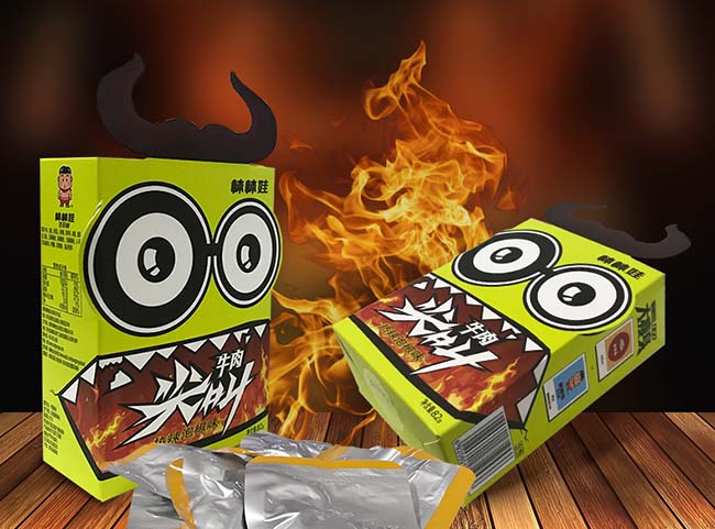 第二、趣味性包裝與商品是一個整體,消費者在支付商品價格的同時也為包裝買了單,因此包裝也就具有了一定的價值,“多感官”包裝設計以創(chuàng)新的思維進行商品包裝,使包裝也成為消費品,商品包裝不再是單純的包裝材料,而是具有趣味性、設計感的商品?!岸喔泄佟卑b設計以更新穎、更大膽的視覺效果或接觸方式,使商品有別于普通商品。如圖二,棒棒娃系列的一款牛肉紙盒包裝,設計師用插畫的手法,有趣的吸引了消費者的注意,尤其是樂于追逐時尚的年輕人,和好奇得的兒童,這樣有趣、新奇的設計方式使這款牛肉包裝盒明顯區(qū)別于其他糖果包裝。
